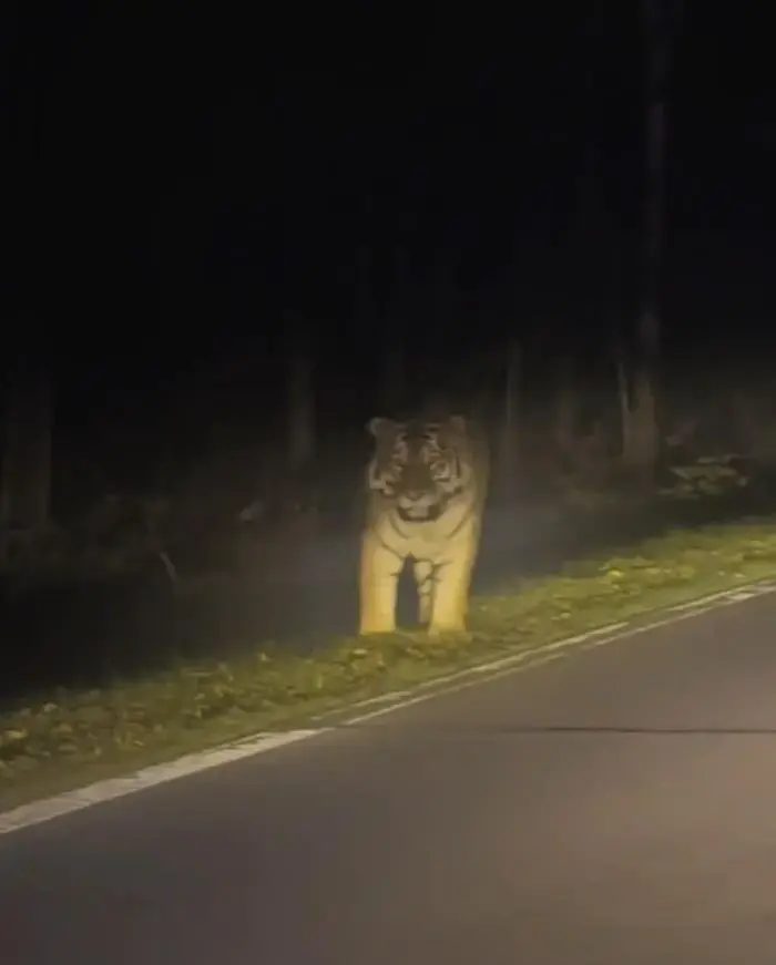而这一次根据报告来看,是在10月18日夜间遇到的,这一位男子在吉林省延边朝鲜族自治州二道白河镇的G331国道附近自驾时,遇到了一只体型较大的野生东北虎,并与其对视5秒左右,随后老虎走下路沿消失在了林间。