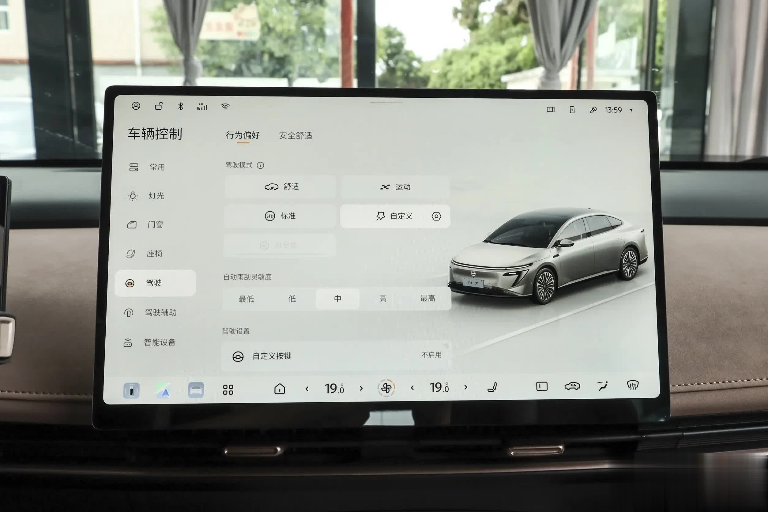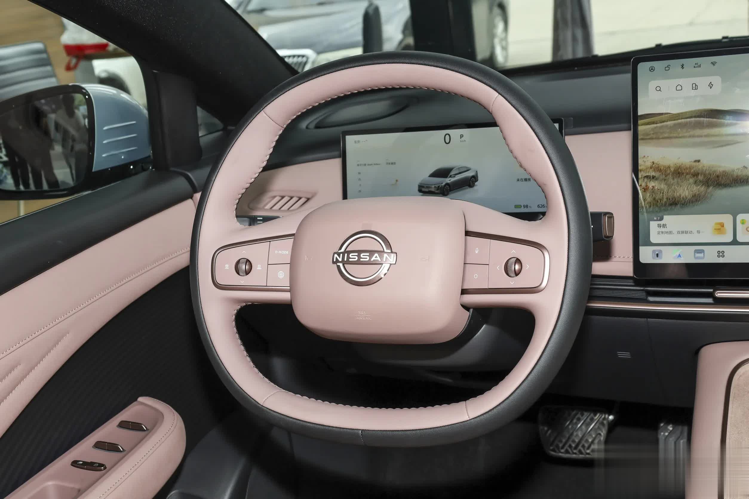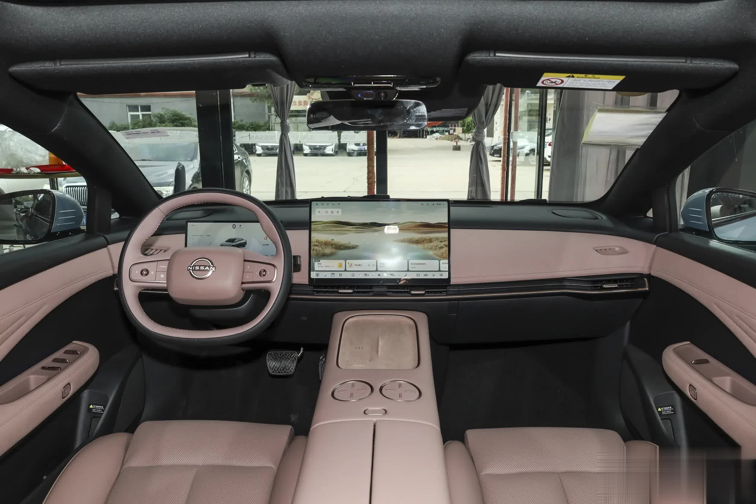来到车内,日产N7的内饰设计也是目前主流的新能源车的风格。两幅式方向盘非常简约,但功能齐全,握感较好,液晶仪表尺寸为10.25英寸,中间是15.6英寸的悬浮屏,副仪表台前方配备了50W手机无线快充面板。